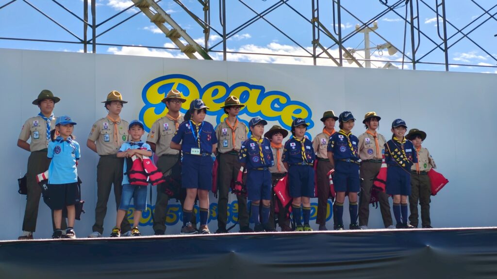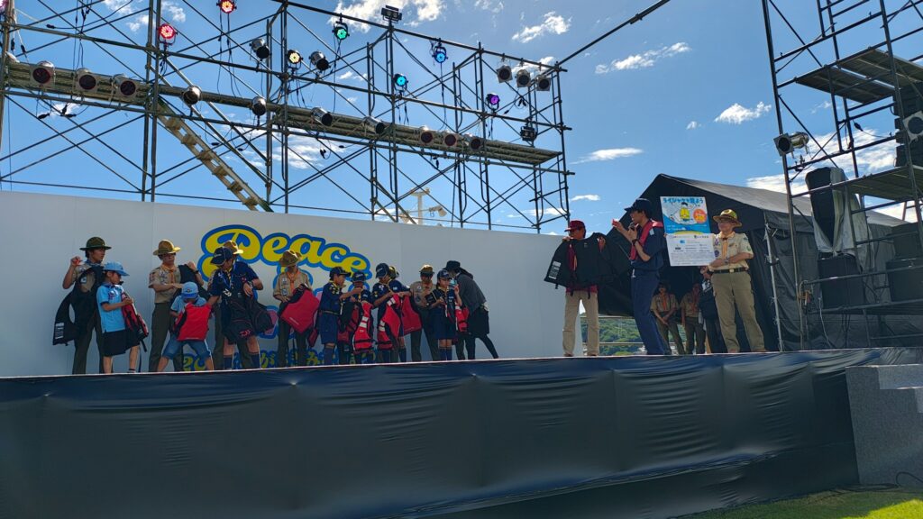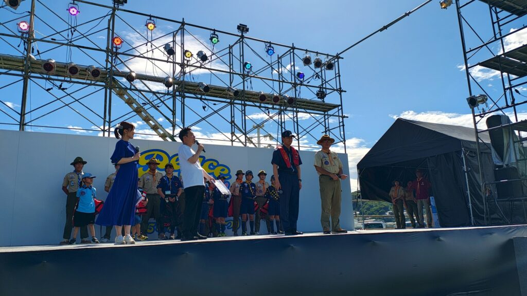 ステージにはボーイスカウト長崎第9団、第13団のビーバースカウト、カブスカウト、ボーイスカウト、ベンチャースカウトが参加し、着用の注意点などを真剣なまなざしてみていました。
