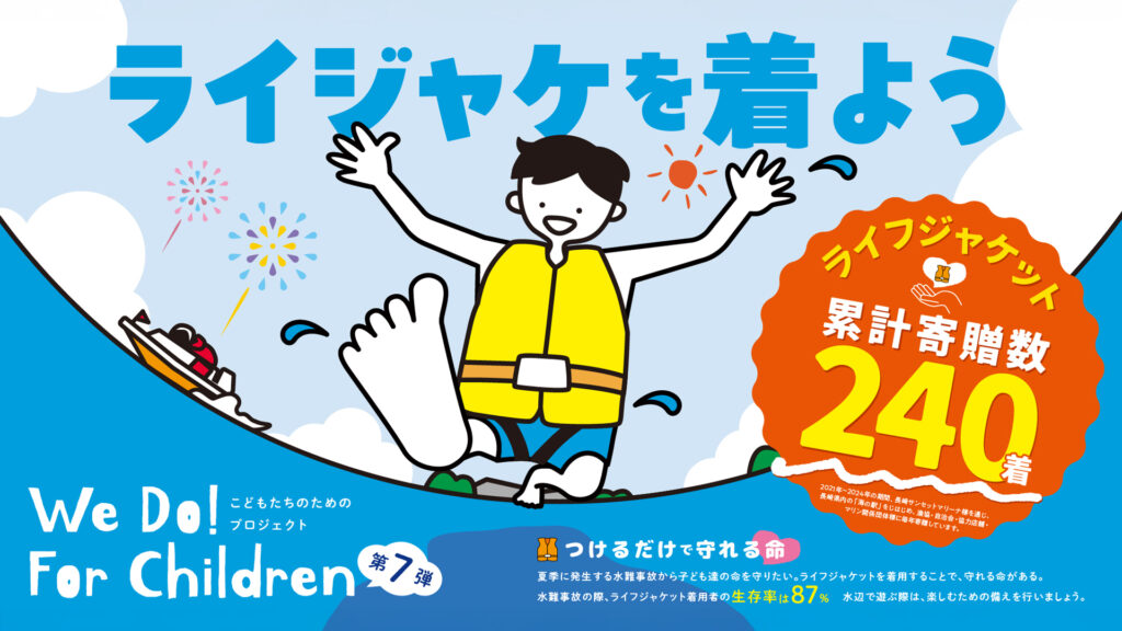 これは、NBC長崎放送様とフラコミュニケーションズ株式会社様(特別協力 GLOBERIDE様)が、不慮の事故から子どもたちを守る活動を行っている 認定 NPO 法人「 Love Safety おおむら」(理事長 出口小児科医院 院長 出口貴美子氏)の企画趣旨に賛同し、未来ある子どもたちの健やかな成長を目的として、放送を通したキャンペーン活動、寄贈品作成、自然・文化・社会体験などの多様な機会の提供など、様々な取組みを行うためのプロジェクトを実施しております。夏季の取り組みとして、水遊びの際のライフベスト着用の啓発に取り組んでいるものです。
